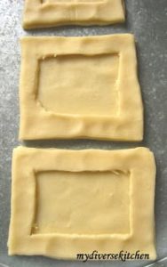 - Roll out the puff pastry into a long rectangle and cut it into smaller rectangles measuring 4u201d by 3 u201c. Cut each rectangle into half. In the picture below you can see three 4 by 3 rectangles cut into half.