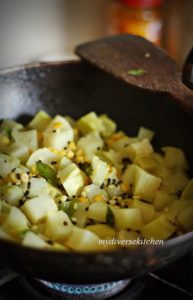 - Take a largish pan and heat the oil. Add the mustard seeds and let them splutter. Add the black gram lentils (urad dal) and stir fry till they turn golden. Then add the cubed kohlrabi, the drained Bengal gram lentils (chana dal), turmeric powder, curry leaves, salt and a cup of water. Bring this to a boil, turn down the heat and cook till the kohlrabi is done.