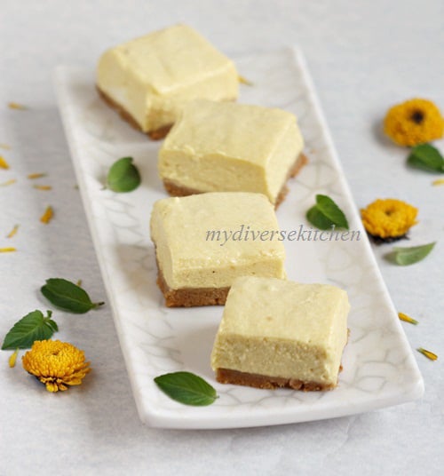 This year, Akshaya also wanted cheesecake. A year back she wouldn’t come anywhere near it but now not only does she like cheesecake but lemon (or lime in my case) cheesecake is her favourite. Since it is mango season here and I had half a dozen Apoos (or Alphonso mangoes which I staunchly maintain are nowhere near the best Indian mangoes!) mangoes, I decided to make Eggless Mango Cheesecake Bars adapted from this recipe of mine. I added some agar to the mango puree to make it set better as I wanted to cut the cheesecake into bars.