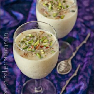 - When ready to serve, spoon the Payasam/ Kheer/ Rabdi into individual servng glasses or dishes and garnish generously with sliced almonds and pistachios. You do need to use blanched almonds, but the ones with their skins. If you lightly toast the nuts before slicing them, they lend a lovely taste to the dessert.
