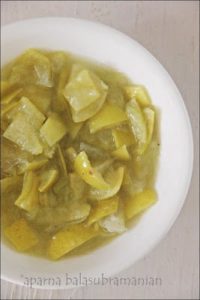 This year I decided to experiment with the Thayir Pachadi/ Khichadi and the Payasam, which is a sweet preparation (and I will blog about next). Some time back I had come across a recipe for a Khichadi made with steam cooked limes from Lakshmi Nair’s Malayalam cookbook Pachakaruchi