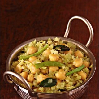 - Heat the oil, add the mustard seeds and allow to splutter. Add the urad dal and allow to brown slightly. Now add the asafetida powder, chillies and curry leaves. Stir once, then add the cabbage, chickpeas, turmeric powder and salt. Mix well and cook for about 2 -3 minutes. Take off heat. Serve warm.