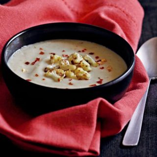 - Remove from the heat and, using a mixer-blender/ hand-held blender, blend until smooth. Stir in the salt and pepper. Warm the soup before serving and garnish with Parmesan cauliflower crumbs and red chilli flakes if desired.