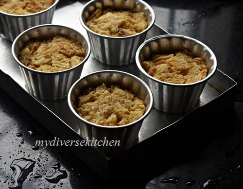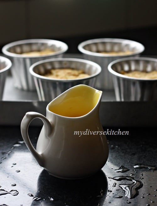 - Place the moulds/ baking dish in a roasting pan. Pour boiling water into the roasting pan carefully so it comes up to about 1/3rd of the moulds. Carefully place the roasting pan with the moulds into your oven and bake the pudding at 180C (350F) for about 22 to 25 minutes. When ready the top of the pudding must be light brown, looking a bit puffed and feel firm to touch. Do not let it dry out. A skewer inserted into the pudding should come out clean.