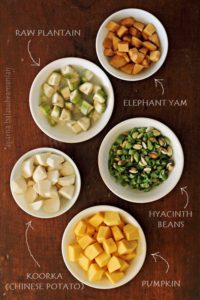 I don’t get Kavathu/ Kachil (Purple Yam) where I live in Goa so I used a combination of Koorka (Chinese Potato), Elephant Yam, Pumpkin, Avarakkai (Hyacinth Beans) and Raw Plantains to make my Kari. The vegetables for Kari, except the Hyacinth beans should be peeled (the raw plantains should have a thin layer skin remaining on them) and cut into approximately 1” cubes. The Hyacinth beans should be trimmed and chopped into about 1/2” thick pieces.