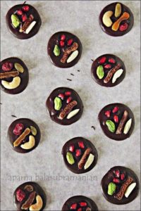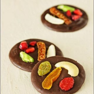 - While tempering my chocolate here, I melted the dark chocolate using the double boiler method, and then added the chopped milk chocolate to it and mixed it in to bring down the temperature. Take this tempered chocolate and drop small teaspoonful of it onto your plastic sheet/ parchment, leaving some space in between. Using the back of the spoon, spread it a little to make small circles about 1 1/2 u201c to 2u201d in diameter . Working with 5 or 6 circles at a time (or they will set quickly), place and 3 items of topping on each circle. Use toppings with colour contrast together for a nice visual effect.