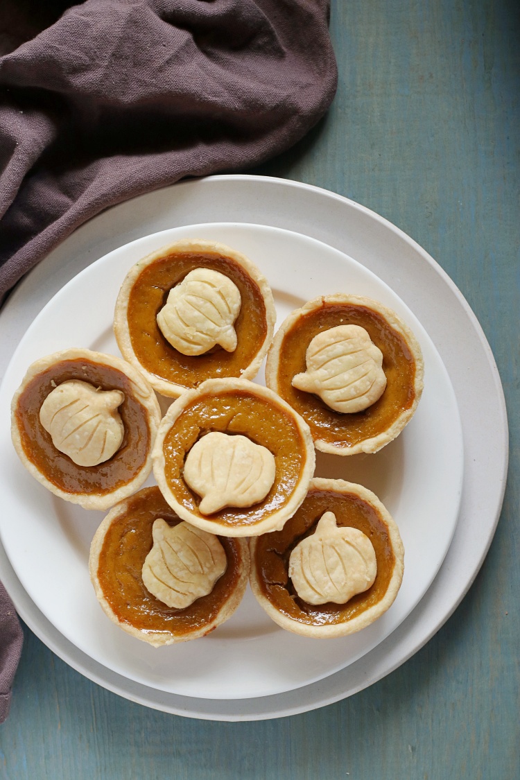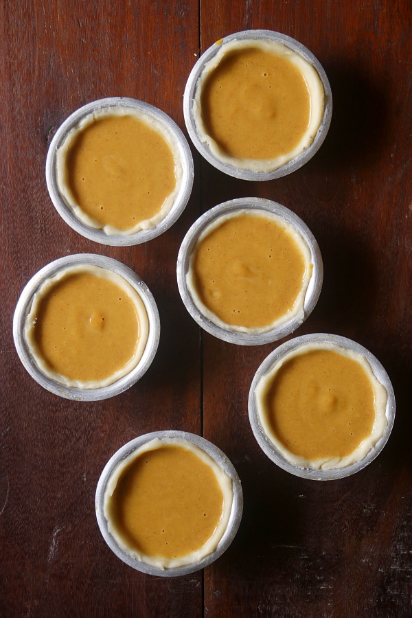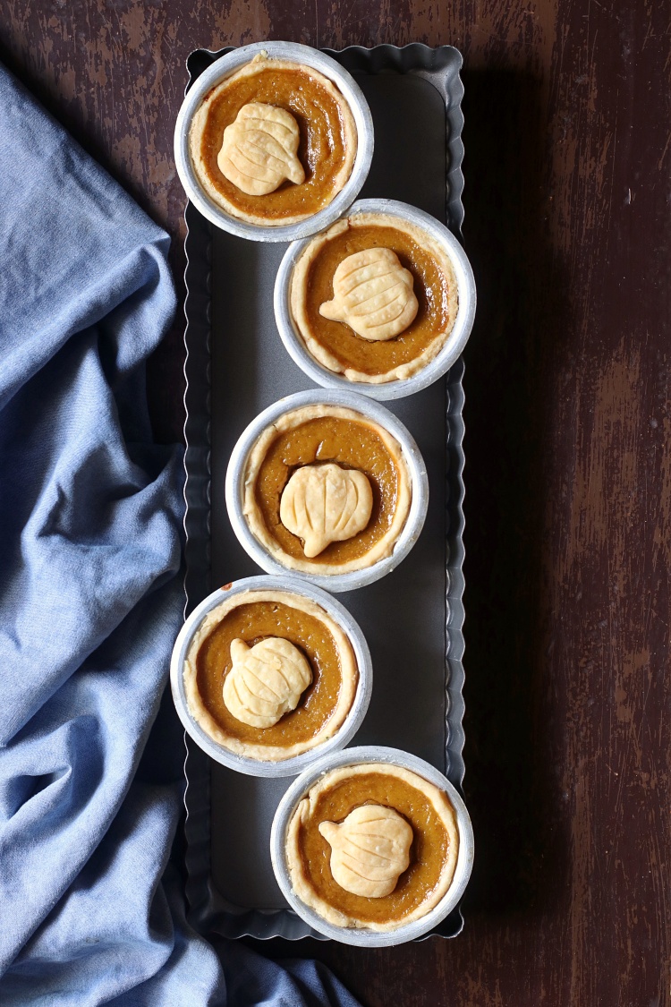 You can make the pie crust dough and pumpkin pie filling separately and refrigerate them. This makes making these mini pies a breeze. Bake them and serve them at room temperature or chilled, with whipped cream or vanilla ice-cream. They can be baked and frozen a week in advance. Thaw them overnight in the fridge the night before serving them. Then warm them up in an 180C (350F) oven for five to eight minutes to crisp the crust.