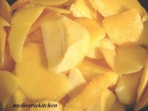 - I usually add the mangoes to the pan with the tempering and mix everything in it. The residual heat of the pan softens the mangoes a wee bit.