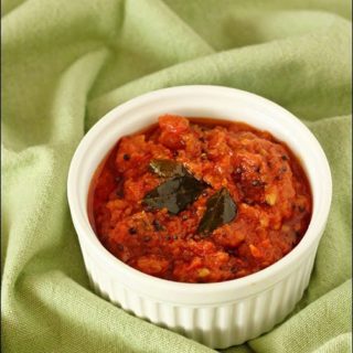 I come from a part of the country where my native style of cooking doesn’t use tomatoes very much and our choice of souring agent has been and still is tamarind. There are however, some traditional dishes that use the tomato quite well like Rasam and I personally use tomatoes a lot in many of my dishes which include a simple salad, home-made marinara sauce, or this chutney which is a family favourite.