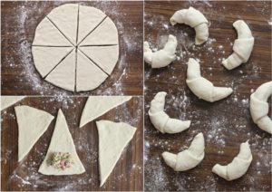 - Shaping these Crescent Rolls is much like one would do for Croissants. Divide the filling into 8 portions or place about a heaped teaspoon of the filling lengthwise on the broad portion of each triangle a little away from the edge. Too much filling will make it difficult to shape the rolls and too little filling means a roll thatu2019s not all that good. Carefully roll the edge over the filling and keep rolling till the point of the triangle into a crescent, sealing the end with a little water if necessary.