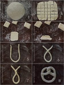 There are different types of German Pretzels like the Wiesnzeit/Oktoberfest Pretzel (made for the Munich Oktoberfest – larger, not so brown and more like bread), Neujahrsbrezel/ New Year Pretzels made in Baden and Schwaben (with milk dough or sweet yeasted dough and no boiling in lye bath), Nussbrezel/ Nut-Pretzel (sweet and made from flaky puff pastry), and the Fastenbrezeln/ Lent Pretzel (made during Lent, light coloured and boiled in water only before baking)