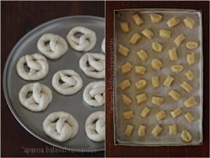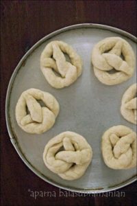 - Shape it into a pretzel and place it on a greased plate or sheet. Working as quickly as you can, repeat with as many pieces of dough that you can bake as one batch while keeping the other bits of dough covered with a damp towel to prevent them from drying out. It is better to work in batches to get better results. Place the shaped dough on the greased plate/ sheet leaving about 1/2" space between them.
